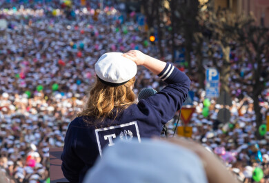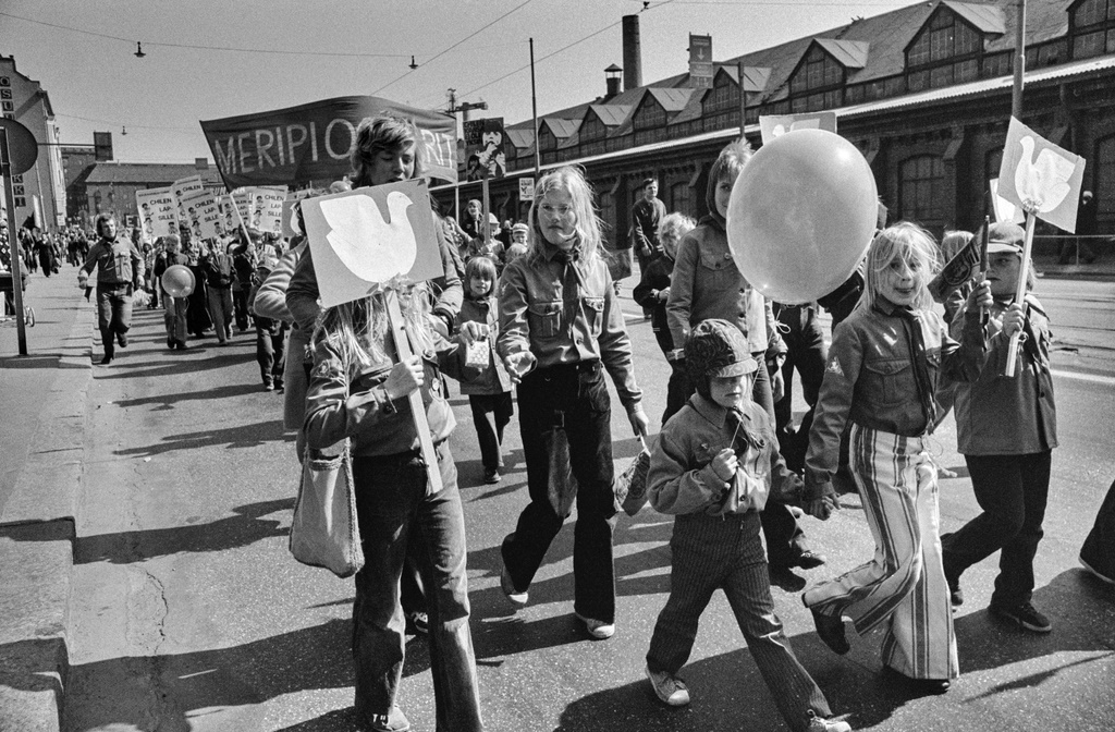 Helsinkiläislapset kantoivat rauhankyyhkyn kuvia vappumarssilla vuonna 1974. Kuvaaja: Harri Ahola. Kuvalähde: Helsingin kaupunginmuseo, G38265. CC BY 4.0.