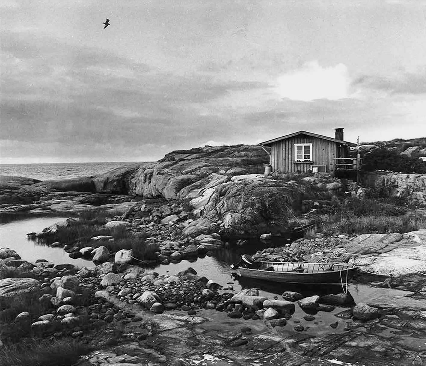 Klovharun mökki rakennettiin Raili ja Reima Pietilän piirrosten mukaan. Sopivan paikan löytäminen pieneltä luodolta oli työn takana. Kallioiden väliin muodostui luonnonsatama, joka suotuisalla säällä tarjosi hyvän rantautumispaikan. Kuva: Per Olov Jansson.