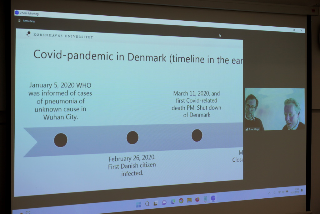 Professori Jens Elo Rytter ja apulaisprofessori Sune Klinge Kööpenhaminan yliopistosta kertoivat, että vierailujen rajoittaminen vanhainkodeissa oli Tanskassa suuri keskustelunaihe, sillä vanhukset ovat siellä merkittävä ryhmä. Kuva: Minna Nerg / Turun yliopisto.