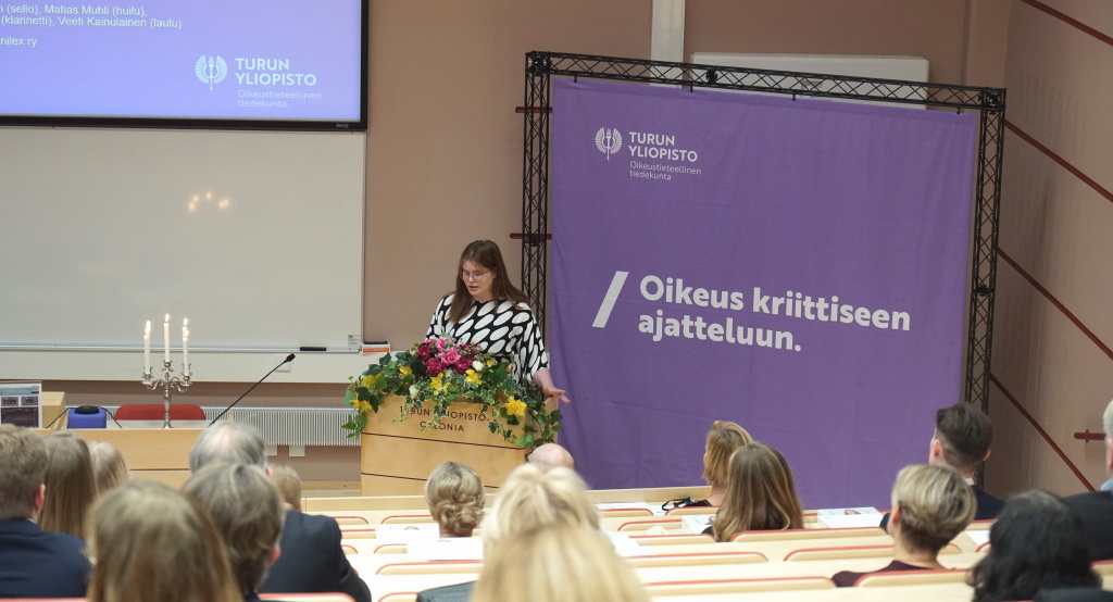 Verkostoitukaa ja tutustukaa uusiin ihmisiin ammattikunnan sisältä ja ulkopuolella, kehotti ainejärjestö Lex ry:n puheenjohtaja Noora Lindqvist. Kuva: Minna Nerg / Turun yliopisto.
