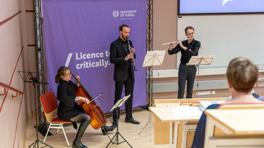 Publiikissa kuultiin myös musiikkiesityksiä. Selloa soitti Ida Kiiskinen, klarinettia Jonas Lund ja huilua Matias Muhli, kaikki tiedekunnan omia opiskelijoita. Laulusta vastasi Veeti Kainulainen. Kuva: Antti Tarponen / Turun yliopisto.