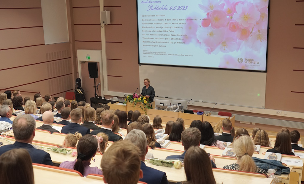 – Valmistumisen hetkeen liittyy useita tuntemuksia: iloa siitä, että tavoite on saavutettu, hämmennystä siitä, mitä uusi tuokaan, sekä tietysti valmistumiseen liittyviä pohdintoja siitä, riittääkö osaaminen ja löytyykö sitä ja toiveita vastaavaa työtä, totesi dekaani Anne Kumpula avaussanoissaan.
