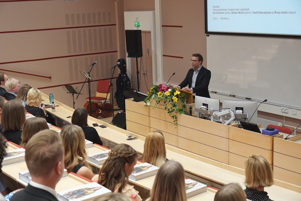 – Ystävyyssuhteiden syventyminen on vähintäänkin yhtä oleellinen osa juristiksi valmistumisessa kuin laadukkaan CV:n laatiminen. Kiireinen työelämä on juristeille tuttua, mutta opiskelun aikana merkityksellisistä ihmisistä ja asioista ei kannata luopua. Noiden ihmisten oppien ja kokemusten varassa olette läpäisseet vaikean tutkinnon, jota voitte tässä vaiheessa katsoa taaksepäin helppona, pohti Havuluoto.