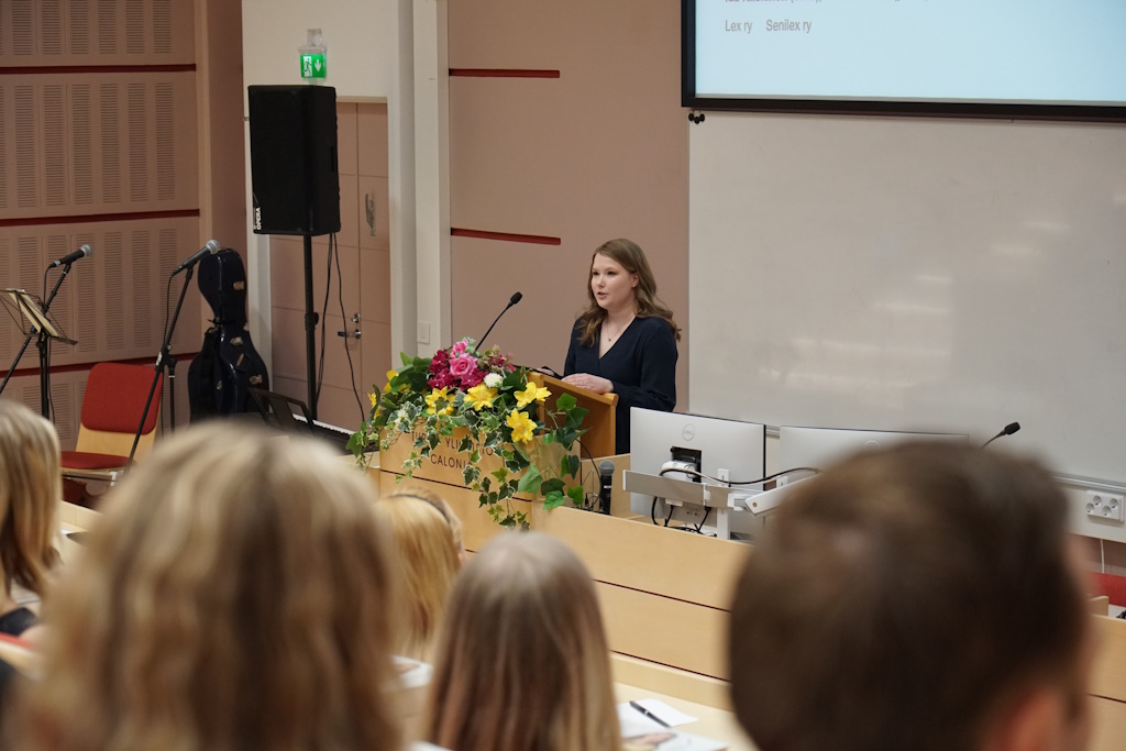 Alumnijärjestö Senilex ry:n tervehdyksen publiikkiin toi Niina Palaja. Hän totesi, että valmistumisen hetki yhden aikakauden päätös ja ylivertainen hetki, mutta oppiminen ei siihen pääty, vaan vasta nyt alkaa oman urapolun rakentaminen.