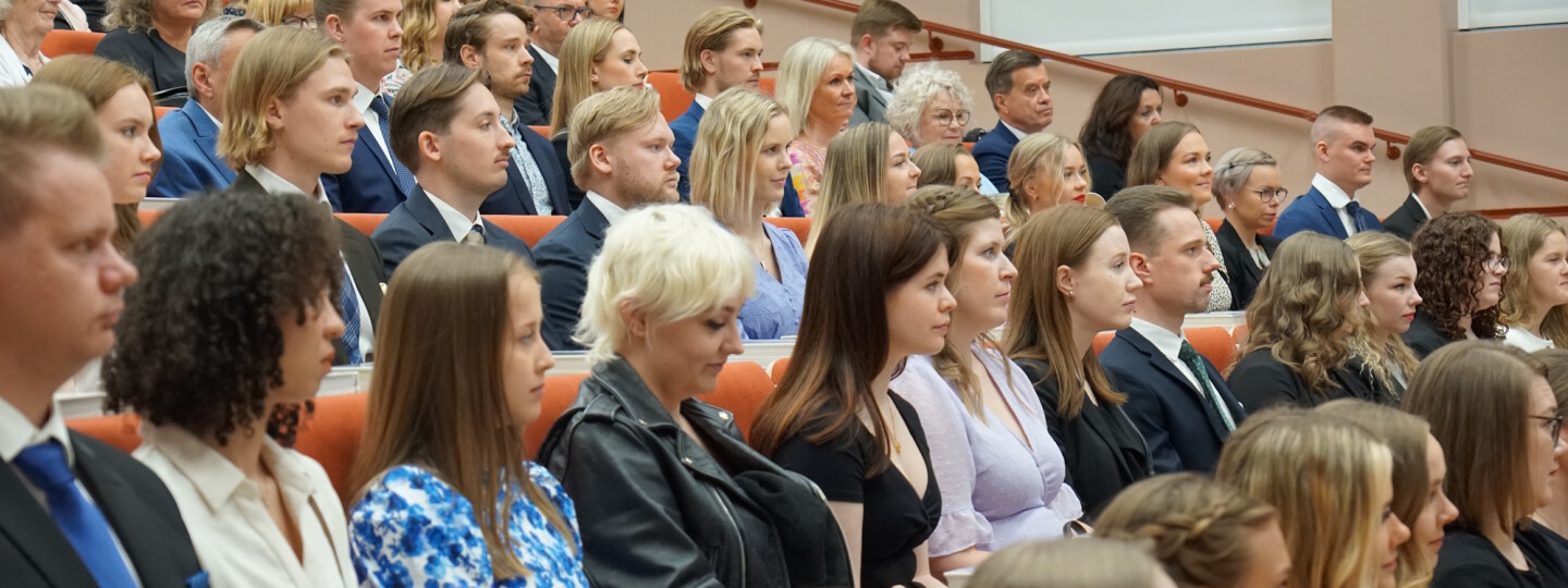 Publiikki, juhlatilaisuus vastavalmistuneille maistereille, pidettiin Caloniassa 9.6.2023. Sali oli lähes viimeistä paikkaa täynnä tuoreita maistereita ja tilaisuutta seuraamaan tullutta yleisöä.