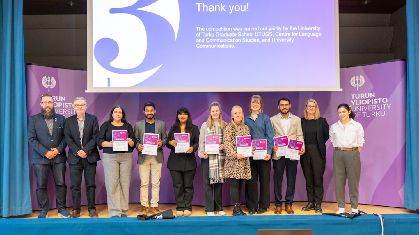 Turun kauppakorkeakoulun OP-salissa keskiviikkona 5.3.2025 pidettyyn 3MT-kilpailun finaaliin osallistui seitsemän Turun yliopiston väitöskirjatutkijaa. Tapahtumassa kilpailijat esittelivät tutkimustaan mahdollisimman mukaansatempaavasti vain kolmessa minuutissa.