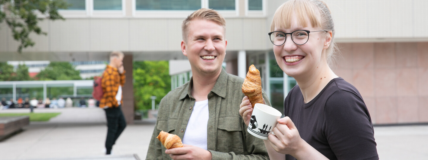 Kielten opiskelu avaa ovet maailmaan, tietävät ranskan kielen opiskelijat Eero Meltovaara ja Hilla-Marja Honkalammi. Kuva: Suvi Harvisalo / Turun yliopisto.