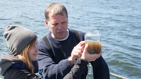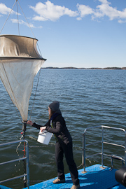 Eläinplanktonhaavilla otettu näyte paljastaa preparaattori Katja Mäkiselle ja silakkatutkimusryhmän vastuulliselle johtajalle Jari Hänniselle, että piilevän värjäämässä Saaristomeren vedessä uiskentelee myös makean veden isokokoista hankajalkaista.