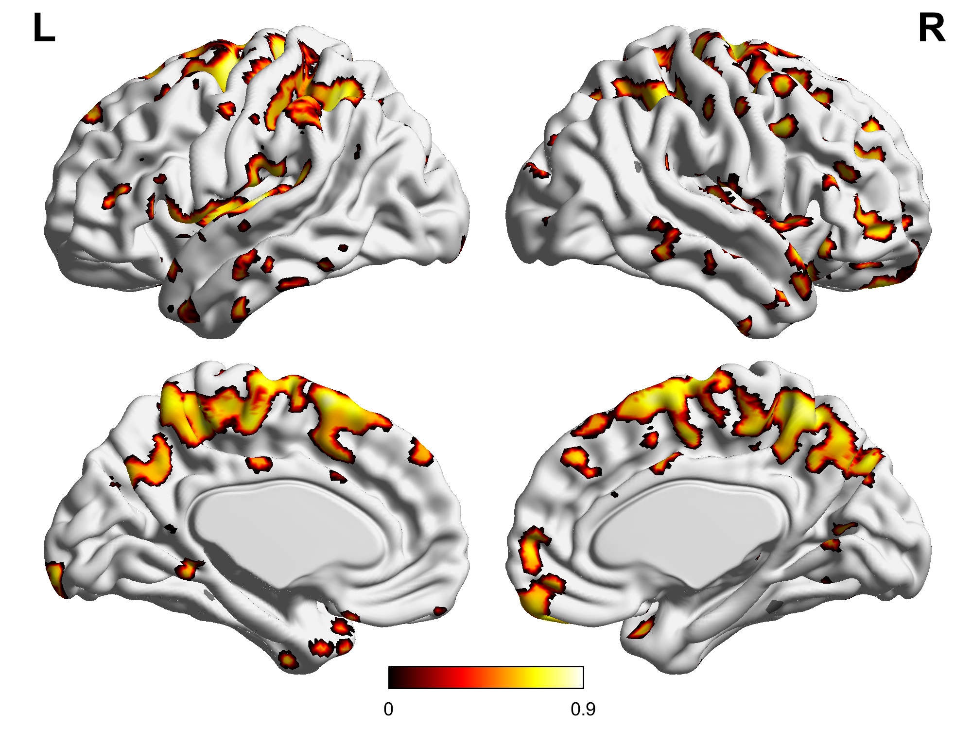 Terveiden, iäkkäiden henkilöiden aivojen mikrogliasolujen aktiivisuus on lisääntynyt aivoalueilla, joissa on amyloidikertymiä. Ne näkyvät kuvassa oransseina ja keltaisina alueina.