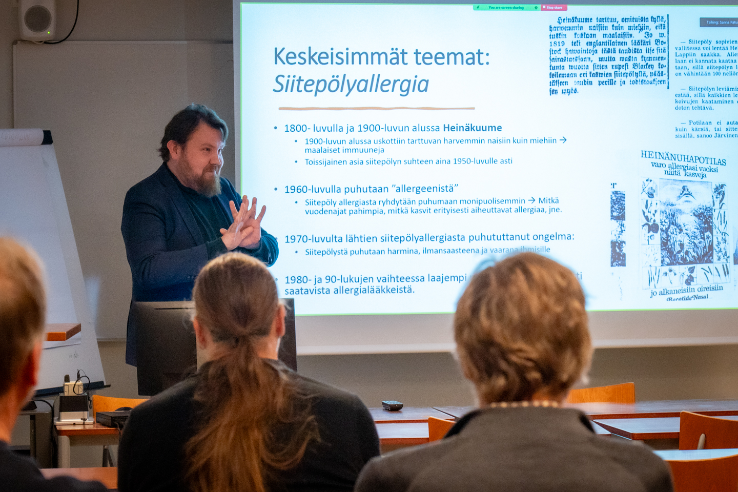 Ensimmäisenä kuultiin historiantutkija, dosentti Otto Latvan esittely siitä, miten siitepölystä on puhuttu Suomen julkisessa keskustelussa 1800-luvulta nykyaikaan.