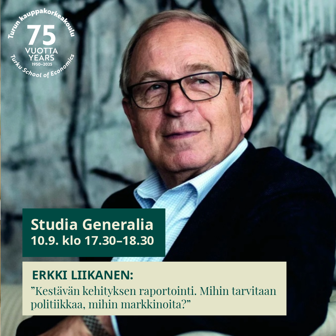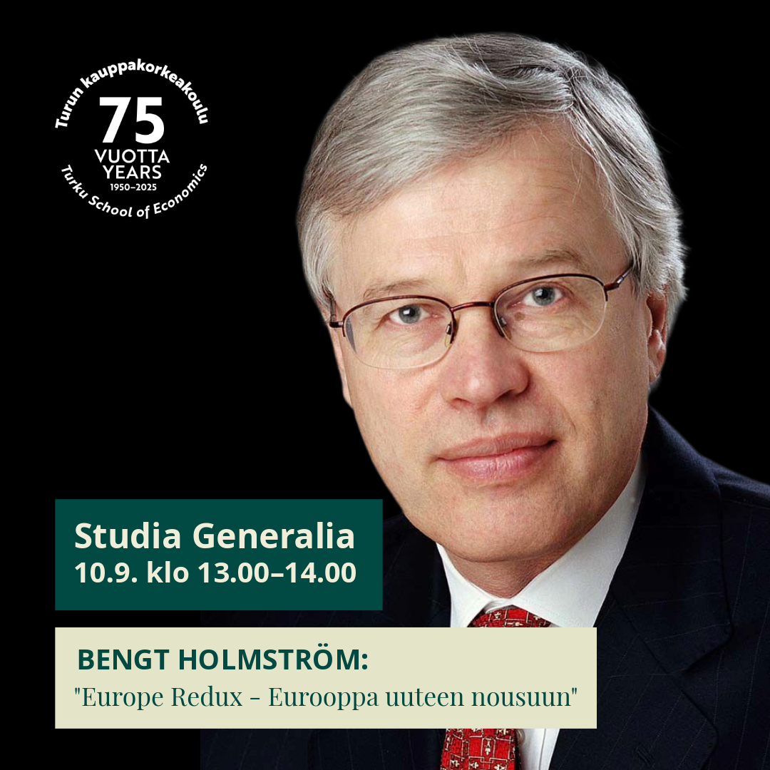 Tervetuloa Turun yliopiston kauppakorkeakoululle kuulemaan kahta Suomen eturivin talousasiantuntijaa samana päivänä. Nobelisti Bengt Holmström luennoi aiheesta "Europe Redux – Eurooppa uuteen nousuun", ja IFRS Foundation Trustees -puheenjohtaja, Suomen Pankin entinen pääjohtaja Erkki Liikanen käsittelee kestävän kehityksen raportointia otsikolla "Mihin tarvitaan politiikkaa, mihin markkinoita?".