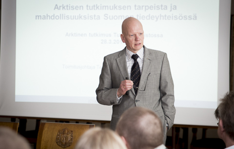 Tero Vauraste puhui arktisen alueen tutkimuksen seminaarissa Turun yliopistossa perjantaina 28.3.2014