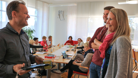 Koulupäivä on jo päättynyt, mutta Ilmaristen koulun opettajanhuoneen pitkän pöydän äärelle on kokoontunut toistakymmentä opettajaa. Jokaisella on kädessään tablettitietokone. Korvat kuuntelevat tarkkaan kollega Arto Kortelaisen neuvoja ja sormet etsivät vinkattuja painalluspisteitä.