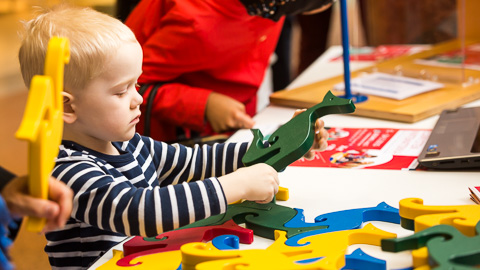 Viisivuotias Emil Siistonen rakensi M. C. Escherin kuvia jäljittelevää kengurupalapelia Elämysten matematiikka -näyttelyn pisteellä.