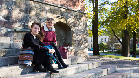 Tuomiokirkon Kirkonrotta muistelee -näyttelyn suunnittelutyö oli osa Sirkku Pihlmanin (oik.) vetämää museologian kurssia. Anna Saarikko (vas.) osallistui kurssille, jossa hyödynnettiin myös historioitsijoiden ja lavastajan asiantuntijuutta.