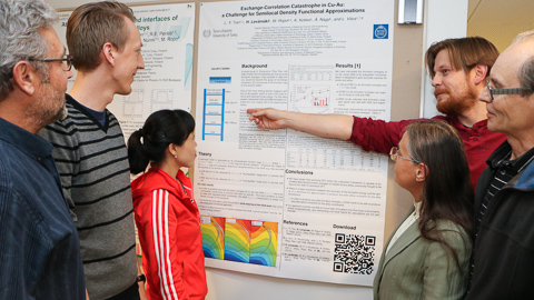 Henrik Levämäellä (toinen vas.) on ollut tukenaan tiimi, johon kuuluvat Ruotsin Kuninkaallisen teknillisen korkeakoulun professori Levente Vitos (vas.), tämän tohtoriopiskelija Li-Yun Tian, Debrecenin yliopiston professori Ágnes Nagy, Tampereen teknillisen korkeakoulun tutkija Matti Ropo sekä oma väitöstutkimuksen ohjaaja, professori Kalevi Kokko (oik.)
