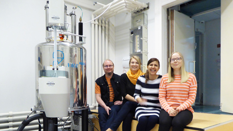 Bruker Avance III 400 NMR-spektrometrin magneetti ja laitekeskuksen tutkijoita vasemmalta erikoistutkija Jari Sinkkonen, post-doc tutkija Aino Alanne, tohtorikoulutettava Tahereh Jafari ja projektitutkija Johanna Salo.