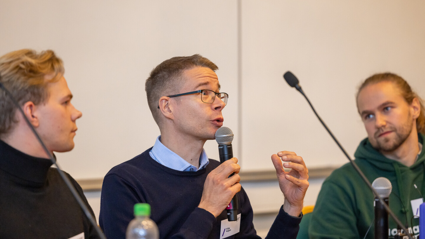 Paneelikeskustelussa pohdittiin, mistä syntyy inspiroiva työyhteisö. Keskusteluun osallistuivat kestävän globaalin liiketoiminnan työelämäprofessori Ville Voipio, kauppatieteen opiskelija, TuKy:n puheenjohtaja Frans Isolauri sekä Kuormat.comin perustaja ja toimitusjohtaja Atte Sahla.