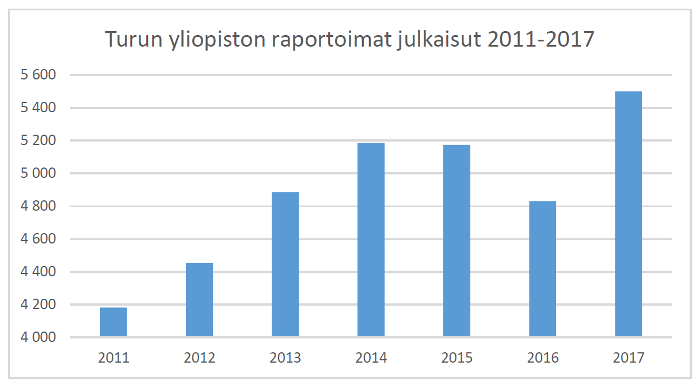 Vuoden 2017 kokonaisjulkaisumäärä, jossa on mukana myös julkaisut, jotka eivät täytä OKM:n tiedonkeruun kriteereitä (kuten konferenssien abstraktit), on 5800 kun vuonna 2016 määrä oli 5300.