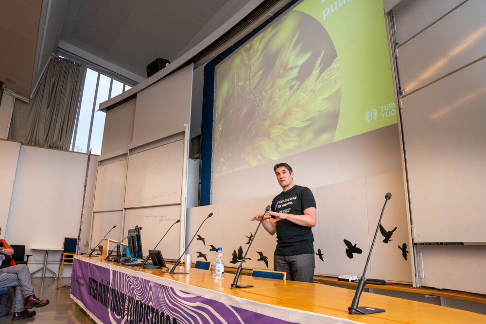 Genetiikan yliopistonlehtori Eero Vesterinen kertoi Turun yliopistossa toteutetuista puutiaisiin liittyvästä kansalaistiedehankkeesta.