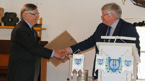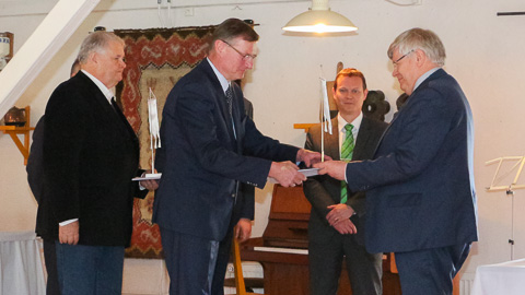 Rehtori Kalervo Väänänen palkitsi tilaisuudessa myös Turun Yliopistosäätiön vuoden yhteistyökumppanit, jotka olivat rakennusinsinööri Kaj Ahvas (vas.), laamanni Leo Laaksonen ja Verdulo Oy:n toimitusjohtaja Janne Salminen. Kolmikko on keskeisesti vaikuttanut Kosti Hämmärön rahaston luomiseen.