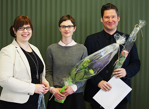 Sirkku Niemi (kuvassa vasemmalla), Mona Mannevuo ja Olli Joukio palkittiin esimerkillisistä opinnäytetöistään humanistisen tiedekunnan järjestämässä Humanistipäivässä 21.4.2016.