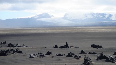 Vatnajökullin pohjoisreuna. Bardarbunga (2009 m mpy) sijaitsee kuvan oikealla laidalla. Kuvan etualalla jäätikköjoen tuomaa hienoa sedimenttiä ja laavakiviä. Vaaleat alueet kuvan tulvatasangolla ovat tulivuoren tephraa (Kuva: Petteri Alho 2007).