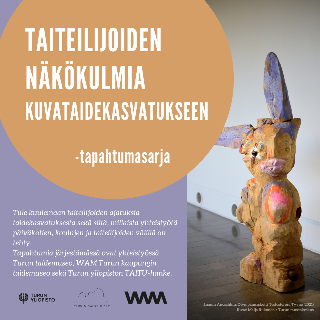 Millaista yhteistyötä päiväkotien, koulujen ja taiteilijoiden välillä on tehty? Se selviää Turun yliopiston, Turun taidemuseon ja WAM Turun kaupungin taidemuseon Taiteilijoiden näkökulmia kuvataidekasvatukseen -tapahtumasarjassa. Seuraavissa tapahtumissa keskustellaan peruskoulujen taidekasvatuksesta ja yhteistyöstä taiteilijoiden kanssa, sarjan päättää tanssikollektiivien kahdeksasluokkalaisille suuntaamien työpajojen esittely.