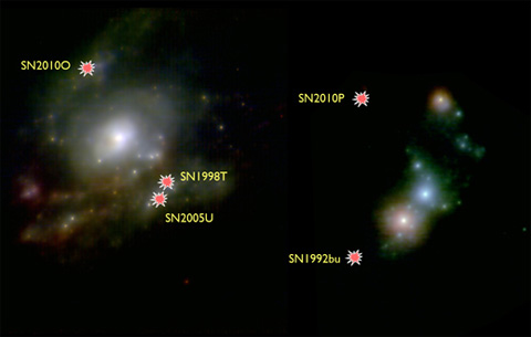 Kirkas infrapunagalaksi Arp 299 kuvattuna Gemini-North-teleskoopilla. Tutkimuksen mukaan Arp 299:n supernovista jopa neljä viidestä on jäänyt piiloon keskusalueissa olevan valtavan pölymäärän taakse. Kuvaan on merkitty galaksissa räjähtäneitä supernovia. Image Credit: Gemini Observatory / AURA ja Angel R. López-Sánchez (Australian Astronomical Observatory / Macquarie University)