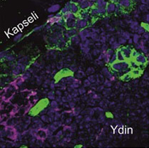 Kuva: Mikroskooppikuvassa näkyy imusolmuke, jossa Plvap-proteiinia (vihreä) on ytimen verisuonten lisäksi myös heti kapselin alla olevissa imusuonisoluissa. Kaikkien solujen tumat on värjätty sinisellä ja tietty valkosoluluokka violetilla.