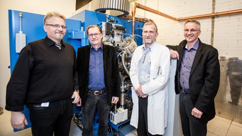 PET-keskuksen kiihdytinlaboratorion tutkimusjohtaja Mikael Bergelin (vas.). radiokemian laboratorionjohtaja Jörgen Bergman, radiokemian professori Olof Solin ja PET-keskuksen johtaja Juhani Knuuti iloitsevat uudesta syklotronista.