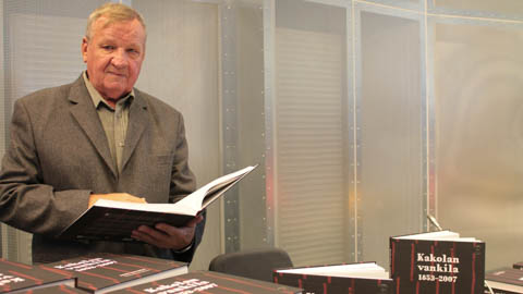 Eläköitynyt vartija Simo Rekikoski tarkastelee järkälemäistä, painotuoretta Kakolan vankila 1853– 2007 -teosta. Vartija Harri Hakamäen käsikirjoituksesta alkanut ainutlaatuinen katsaus Kakolan vankilan historiaan laajeni Turun yliopiston kansatieteen tutkijoiden käsissä teokseksi, joka piirtää turkulaisen vankeinhoidon historian Turun linnasta Saramäkeen. – Tällä kirjalla on suuri merkitys, Simo Rekikoski sanoo.