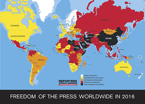 Kartta kuvastaa median sananvapauden tilaa vuonna 2016. Suomi on merkattu valkoisella, mikä tarkoittaa tilanteen olevan hyvä. Toimittajat ilman rajoja -järjestön mukaan sananvapaus kuitenkin kutistuu maailmalla koko ajan. Esimerkiksi Kanada oli vielä viime vuonna valkoisessa kategoriassa, mutta nyt se on siirtynyt astetta huonompaan luokkaan.