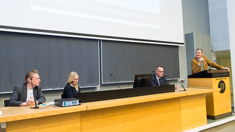 Toimittaja Tuomas Muraja (vas.), tutkijatohtori Reetta Pöyhtäri, eduskuntatutkimuksen keskuksen johtaja Markku Jokisipilä ja Toimittajat ilman rajoja -järjestön puheenjohtaja Ilkka Nousiainen keskustelivat sananvapauden rajoista paneelikeskustelussa 8.12.2016 Turun yliopiston Tauno Nurmela -salissa.