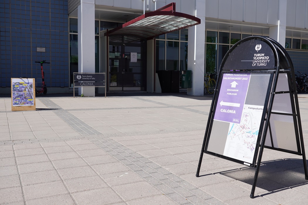 Kyltit opastavat kampuksella valintakokeeseen saapuvia oikeisiin rakennuksiin. Kuva: Minna Nerg / Turun yliopisto.