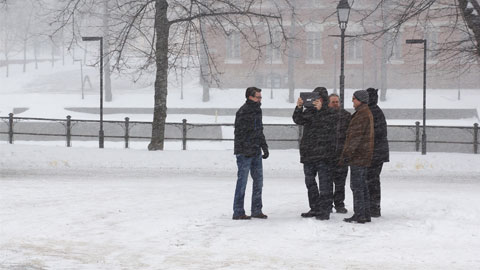 "Luonnonolosuhteetkin on huomioitava, kun tehdään sovelluksia matkailukäyttöön." Tutkijat saivat tästä konkreettisen esimerkin, kun Pyhän Hengen kirkon virtuaalimallia demonstroitiin Aurajokirannassa 8.3.2013. Kuva: Seppo Helle
