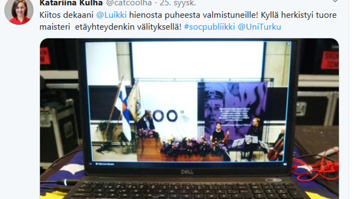 Katariina Kulhan twitterviesti ja siihen liitetty kuva kahvikupista läppärinäyttöineen kuvaa vuonna 2020 valmistuneiden ainutlaatuista opiskelujen lopputaivalta. Yhteiskuntatieteellisen tiedekunnan maisterien, lisensiaattien ja tohtoreiden publiikki vietettiin ensimmäistä kertaa etänä.