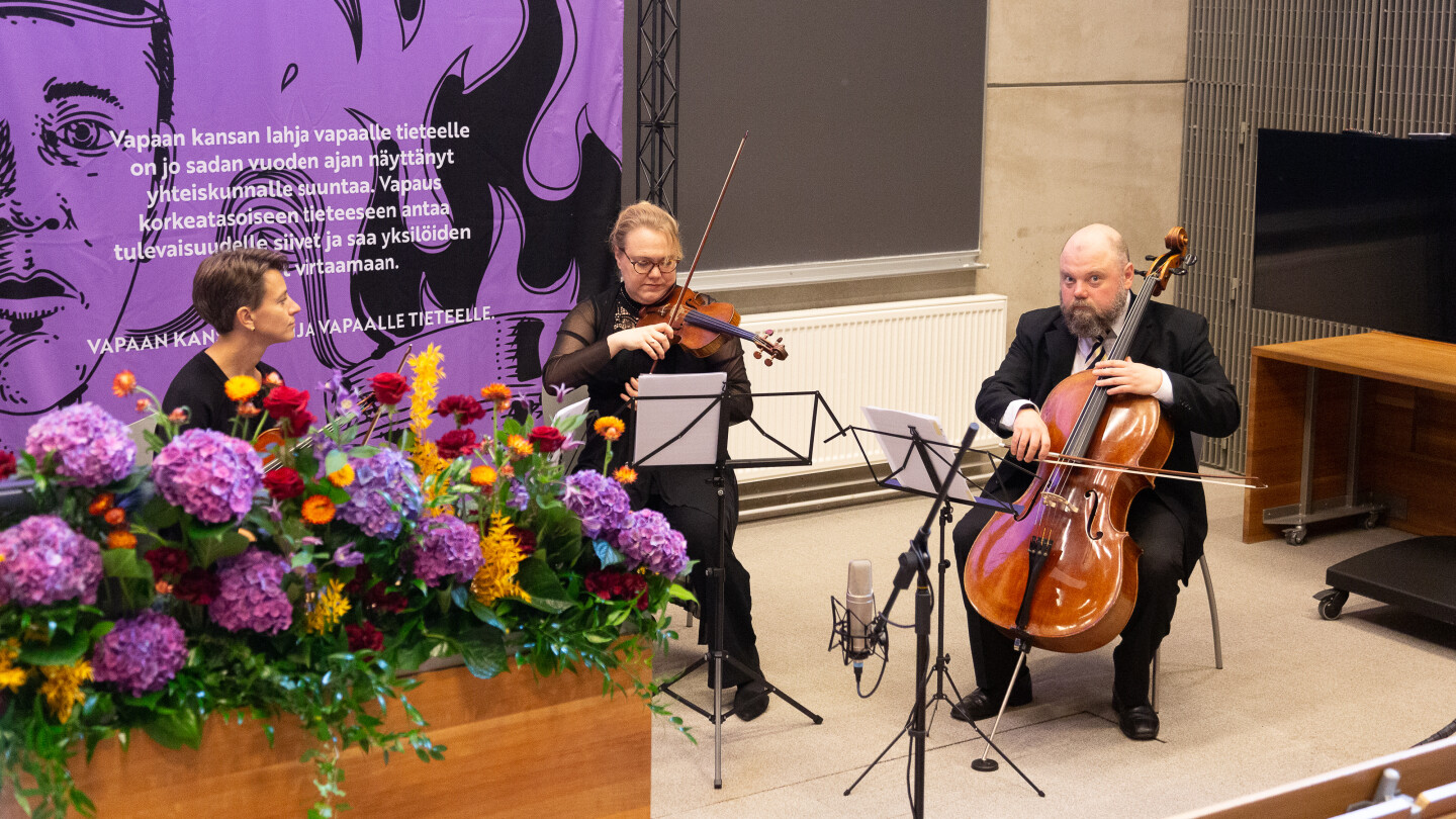 Viulistit Katariina Sallinen (vas.) ja Katriina Rainio sekä sellisti Samuli Paavilainen esittivät juhlassa muun muassa 1749 ensimmäistä kertaa esitetyn Georg Friedrich Händelin Music for the Royal Fireworks -sarjasta La Réjouissance-osan. Juhlapuheessaan dekaani Louis Clerc mainitsi teoksen ensiesityksen esimerkkinä siitä, että huonomminkin voisi mennä kuin se, että koronan vuoksi jouduttiin etäyhteyteen. –Kun teos soitettiin ensimmäistä kertaa, esityslava syttyi palamaan. Kaksi sotilasta sai vakavia palovammoja ilotulituksista, kolmas menetti näkönsä, neljänneltä irtosi käsi kun ilotulitusraketti räjähti hänen lähellään. Erään naisen puku paloi, ja hänet jouduttiin heittämään läheiseen järveen. Lehdistön mukaan konsertti oli ”a smashing success”, Clerc kertoi.