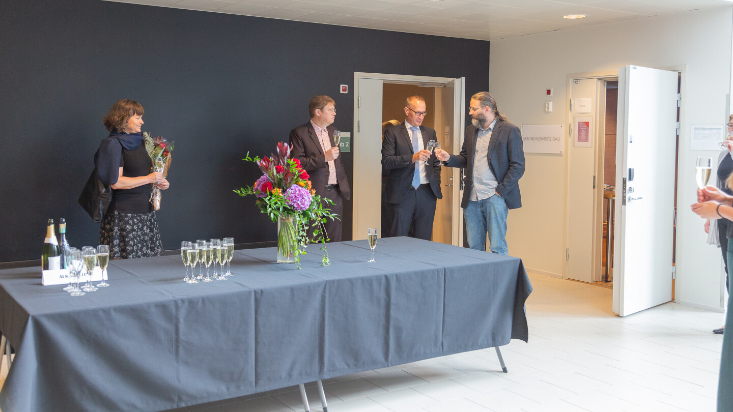Juhlapaikalla maljan saattoiva nostaa vain pieni joukko juhlaväkeä. Publicumin aulassa valmistuneille skoolasivat alumni Terhi Lehtonen, valtio-opin yliopistonlehtori Antti Pajala, Eduskuntatutkimuksen keskuksen johtaja, apulaisprofessori Markku Jokisipilä sekä dekaani, poliittisen historian professori Louis Clerc.