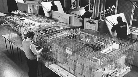 Ennen tietokoneiden aikaa suunnittelijat rakensivat suunniteltavasta kohteesta muovimallin mittakaavassa. Elomaticin suunnittelijat töissä vuonna 1980.