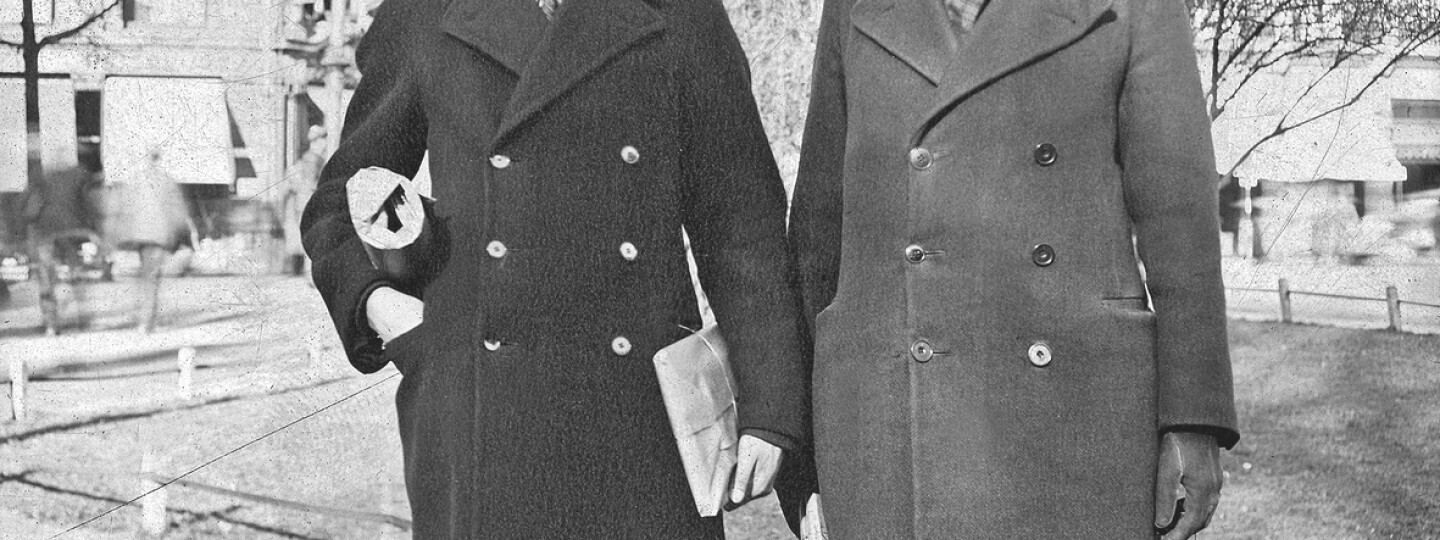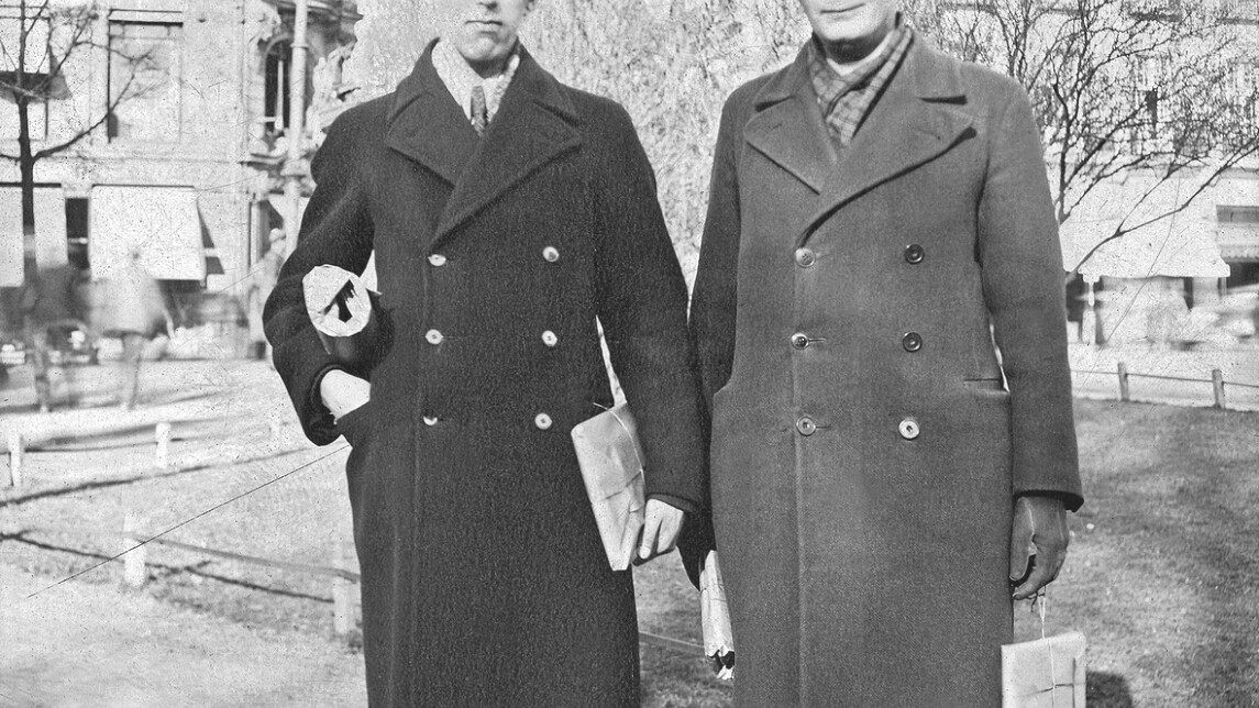 Mauri Ryömä ja Jarno Pennanen vuonna 1938 Tukholmassa, Grand hotellin edessä. Ruotsin-matkoihin liittyi usein aatetovereiden tapaamisia, osallistumista kansainväliseen yhteistyöhön tai aineistojen noutamista omia lehtiä varten. Kuva: Kansan Arkiston valokuvakokoelmat.