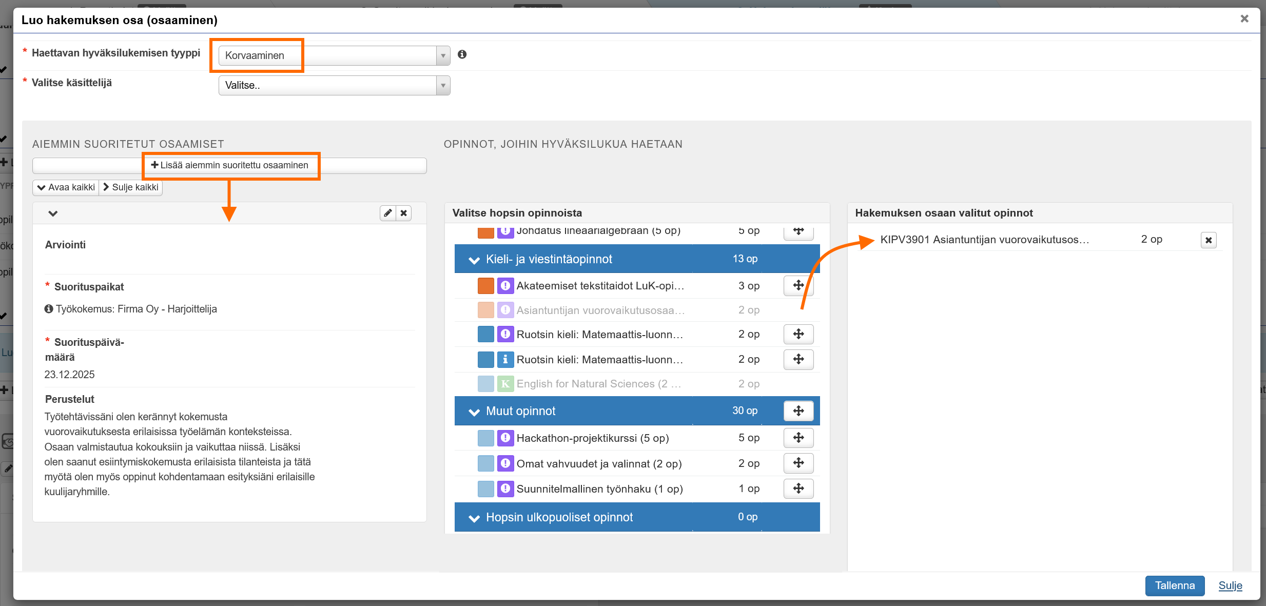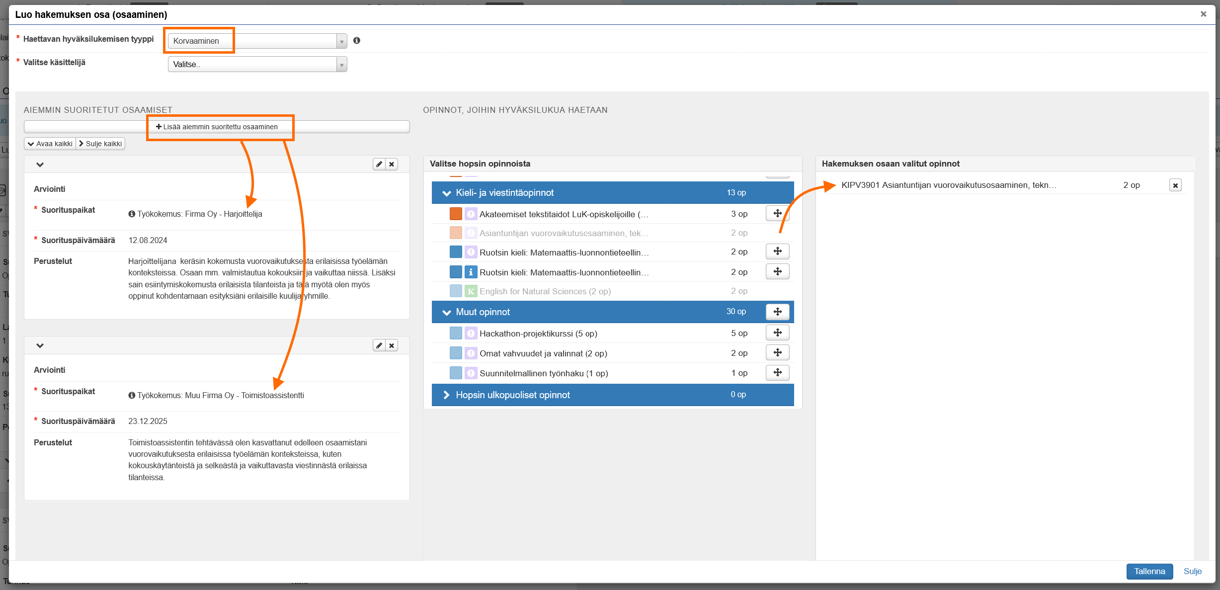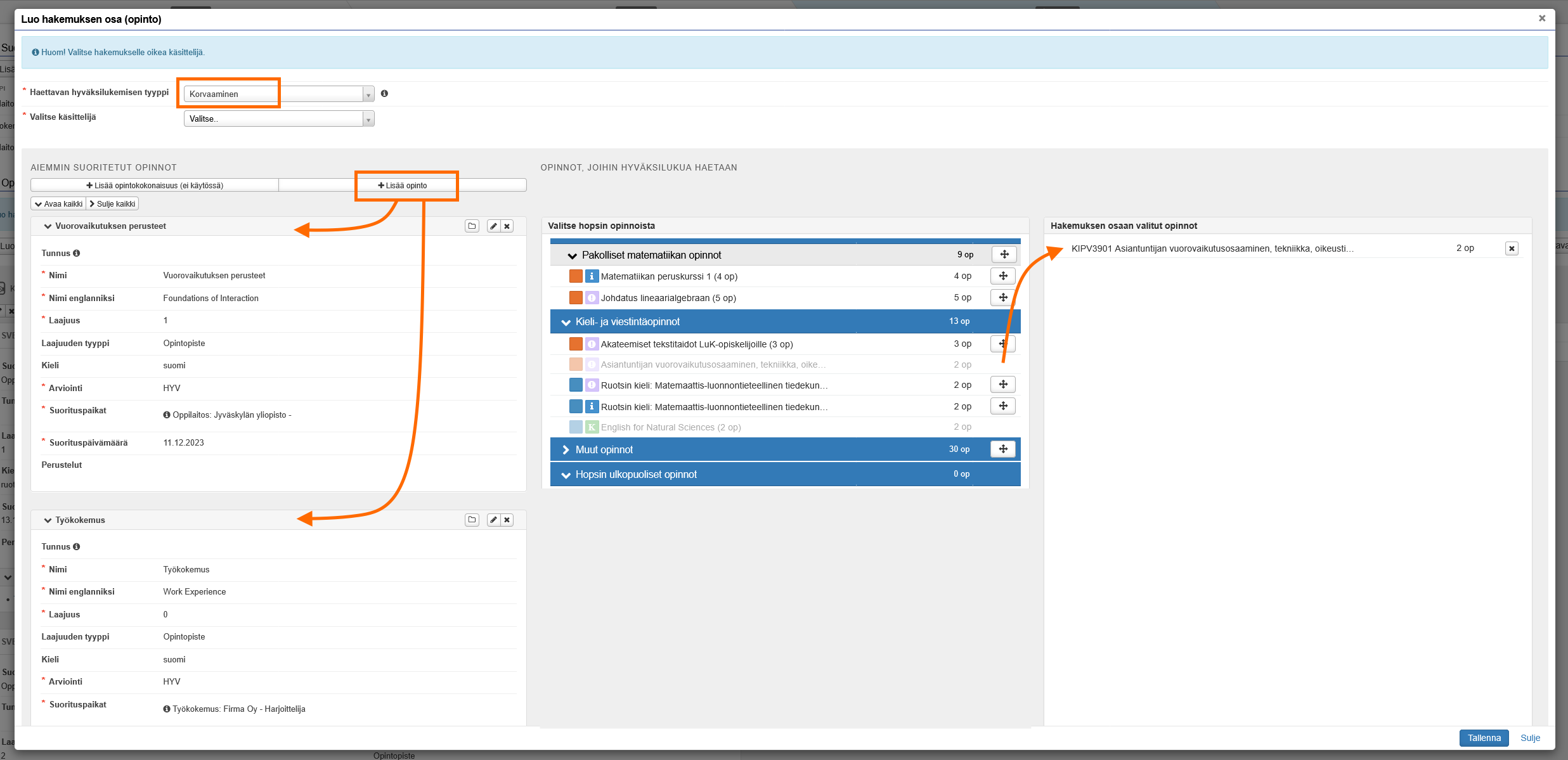 - Tällaisissa tapauksissa hakemukselle luodaan erilliset hakemuksen osat jokaista korvattavaa opintojaksoa varten. Vaihtoehtoisesti voit myös luoda kokonaan uudet hakemukset jokaista korvattavaa opintojaksoa varten.