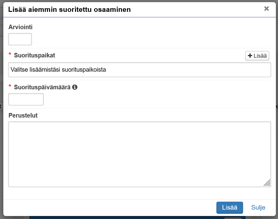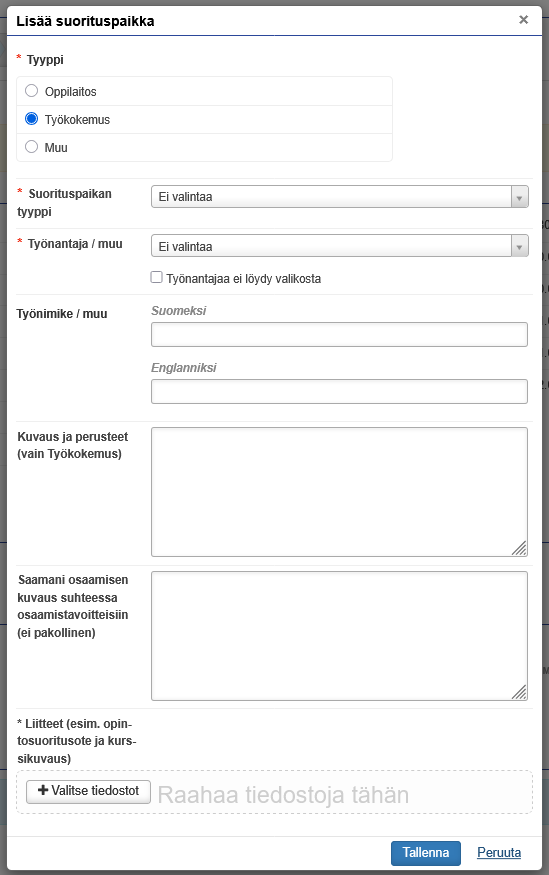 - Valitse Suorituspaikan tyyppi -valikosta joko Työkokemus tai Muualla suoritettu.