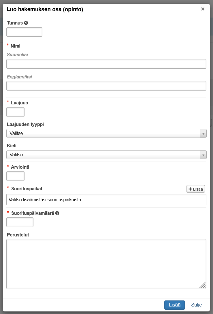 - Voit tarvittaessa lisätä toisen suorituspaikan samalle hakemukselle valitsemalla uudestaan +Lisää suorituspaikka.