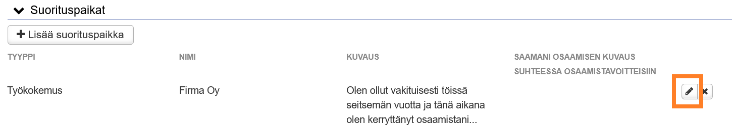 - Suorituspaikan tietoja ja liitteitä voit muokata klikkaamalla suorituspaikan nimen vieressä olevaa kynä-ikonia.