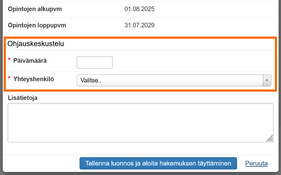 - Peppi hakee hakemukselle automaattisesti opiskeluoikeutesi perustiedot, mutta ikkunan alaosassa olevat ohjauskeskustelun tiedot on täytettävä erikseen.