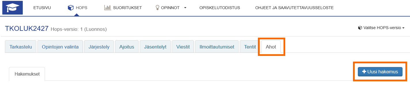 - Avaa HOPSisi ja valitse HOPSin Ahot-välilehti. Vaihtoehtoisesti valitse työpöydän yläpalkista Opinnot > Hyväksilukuhakemukset.