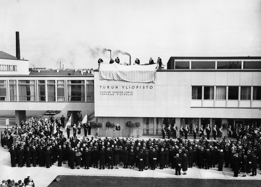 Yliopiston uusien rakennusten vihkiäisjuhla 23. toukokuuta 1959. Päärakennuksen inskriptio, "Turun Yliopisto – vapaan kansan lahja vapaalle tieteelle" paljastetaan presidentti Urho Kekkosen puheen aikana.