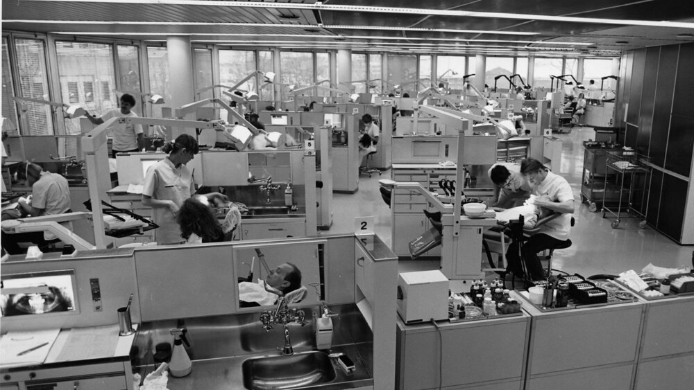 Työskentelyä Turun yliopiston hammaslääketieteen laitos -rakennuksen suuressa klinikkasalissa v. 1987.