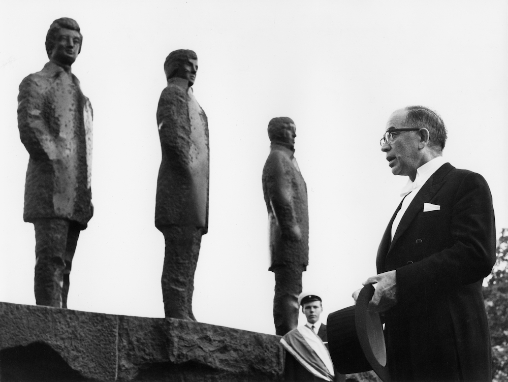 Rehtori Tauno Nurmela puhumassa "Runeberg, Lönnrot, Snellman" -patsaan luovutustilaisuudessa v. 1968. Patsas tunnetaan myös nimellä "Kolme vekkulia", ja edustaa kolmea kansallista suurmiestä, jotka aloittivat opintonsa Turun akatemiassa v. 1822. Lisätietoa patsaasta